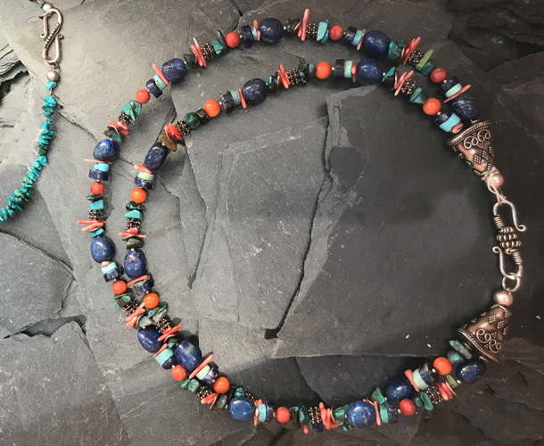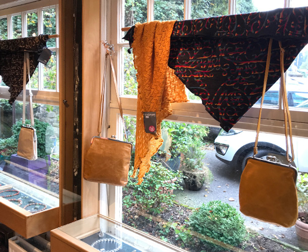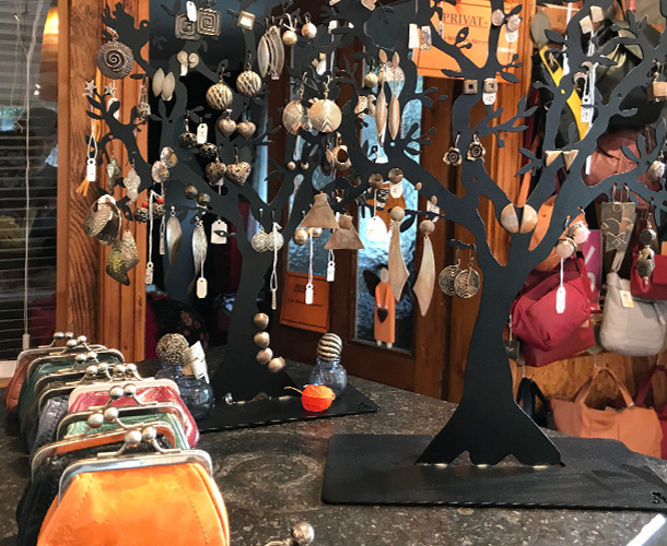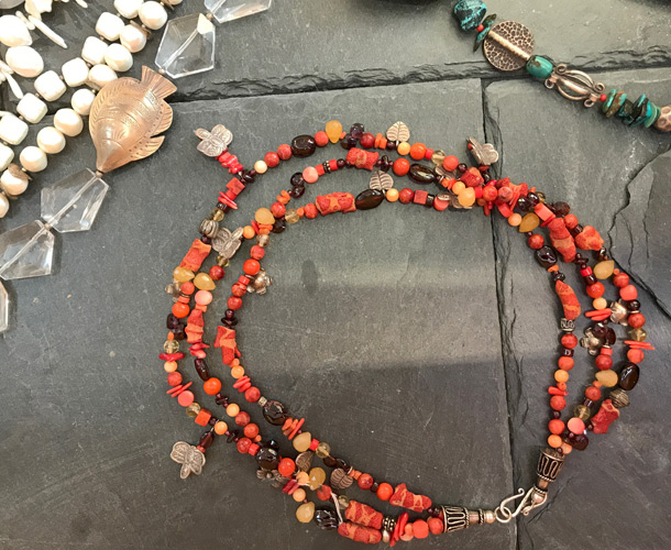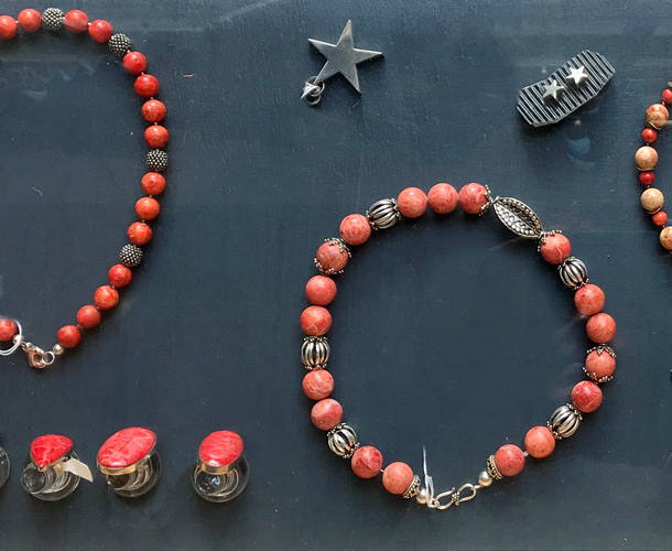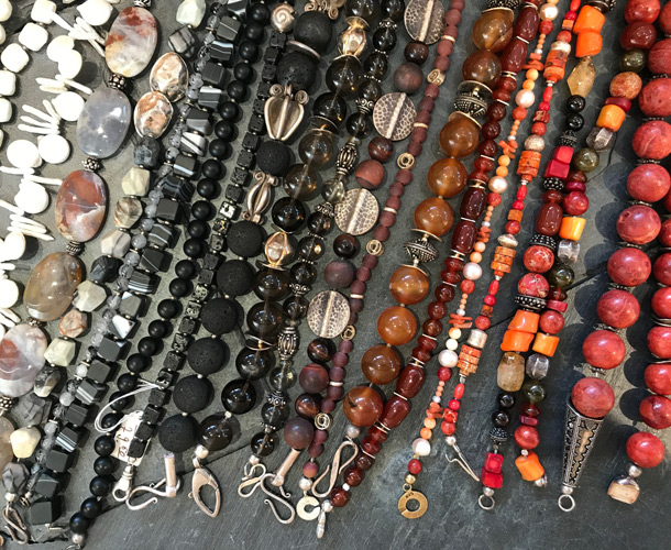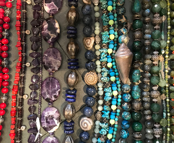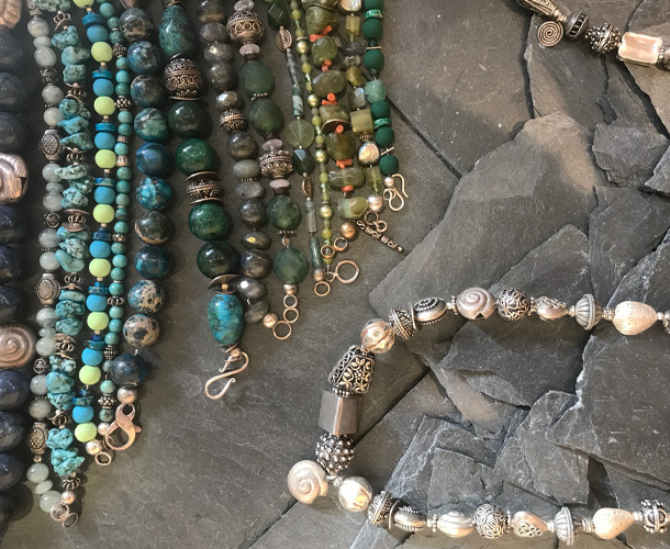 Unser reichhaltiges Schmucksortiment besteht aus handgefertigte Edelsteinketten, Ensembles, Silberschmuck, Ringe, Armbänder, Ohrringe und Anhänger. Alle unsere Ketten sind handgearbeitete Einzestücke, die wir nach eigenen Entwürfen in unserer Werkstatt für Sie fertigen. Modisch abgestimmt gibt es dazu jede Menge Taschen, Portemonnaies, Schals und Tücher.