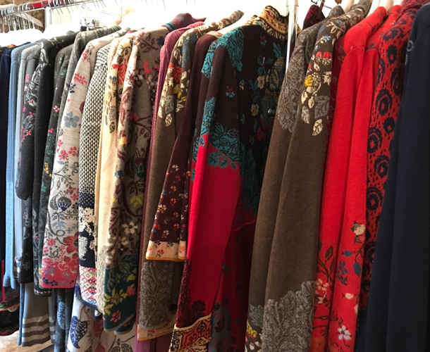 Saisonal wird eine große Auswahl an schöner, neuer Garderobe angeboten. Der Fokus liegt hier in erster Linie auf Kleidern, jedoch sind auch Jacken und Mäntel im Angebot – vielfach feinste Strickwaren. Und wer sich ein Stück Zierrat-Flair mit nach Hause nehmen möchte, der findet eine große Auswahl an farbenfrohen Dekorationsartikeln und Wohnaccessoires.